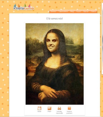 O aplicativo permite também guardar uma cópia da imagem final e compartilhar com a galera enviando por e-mail. O PhotoFunia está traduzido ao português, embora a tradução seja incompleta e às vezes alguns elementos apareçam em inglês.